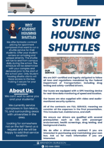 We offer fantastic contract pricing for apartment complexes who want to run a shuttle service for their students. Offer your student renters an amazing and unique amenity. The shuttle will run to and from campus daily during the school. The schedule will be determined with your complex and delivered prior to the start of the school year. Only Student housing shuttles clients will have access to the bus, making it secure for your complex.